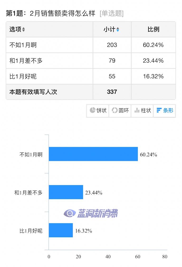 调查显示,只有16.3%的店主2月销售业绩比1月好,和1月差不多的有23.4%,另有60.2%的店主生意比1月差,2月由于有春节假期,可能会是全年最低。