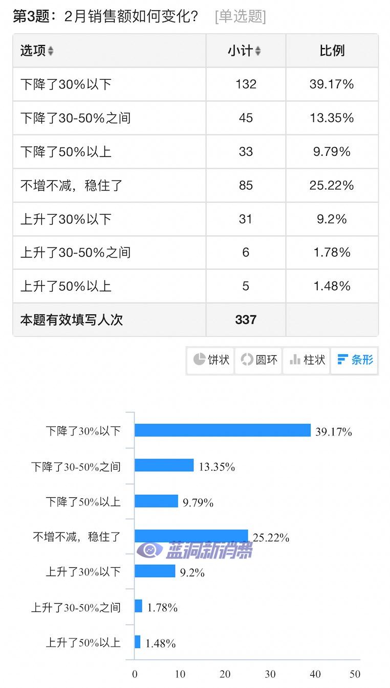 调查显示,39.2%的店主下降了30%以下,有25.2%的店主处于不增不减状态,销售上升的占比仅12.5%。