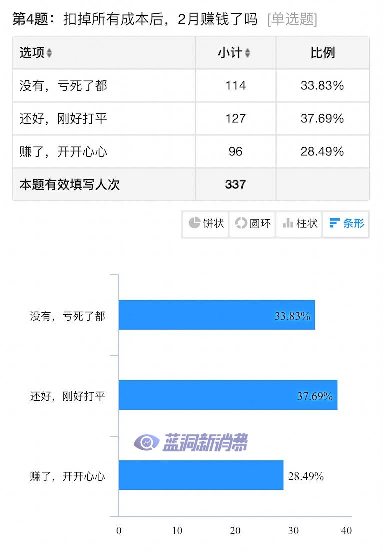 调查显示,28.5%的店主表示扣除成本后赚钱了,37.7%的店主打平,相当于白干,33.8%的店主不赚钱还倒贴。