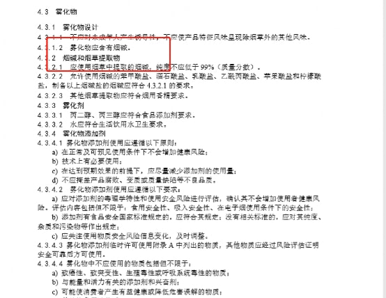 还谈及一些技术及要求等。如雾化区域温度不得高于350度;烟具不应出现漏液,雾化物中烟碱浓度不应高于20mg/g,烟碱总量不应高于200mg;还有重点的“一禁和一限”(即为禁烟具的自行注油、限口味)。