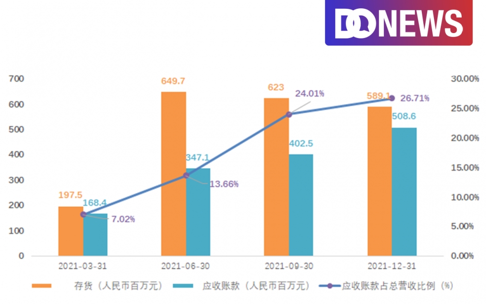 图2:雾芯科技21年单季度库存及应收账款情况 来源:雾芯科技财报 制图:DoNews