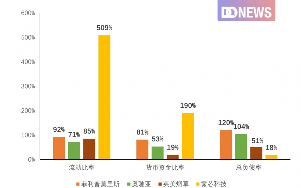 图5:雾芯科技与国际前三公司的资金状况对比图 来源:各公司财报 制图:DoNews