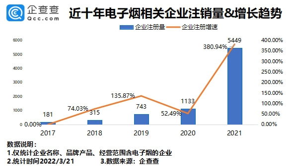 企查查数据显示,近5年我国电子烟相关企业注销量逐年上升。2019年电子烟相关企业注销量为743家,同比增长135.87%。2020年注销1133家,同比增长52.49%。2021年注销5449家,同比增长380.94%。