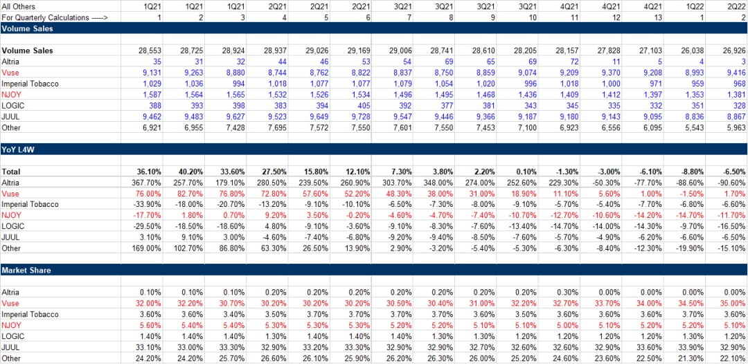 除此之外,美国换弹式产品市场受到监管相对较为宽松的一次性电子烟与合成尼古丁类产品挤压,就一次性产品的长期跟踪数据来看,依然保持着良好的势头,有部分厂商出货量仍然保持着超过50%的增长。