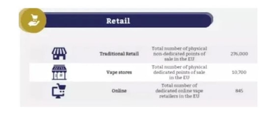 传统线下零售是电子烟主流销售渠道,欧盟境内有27.6万个非指定实体销售点和1.07万个电子烟实体专卖店,而网上专卖点仅有845个。