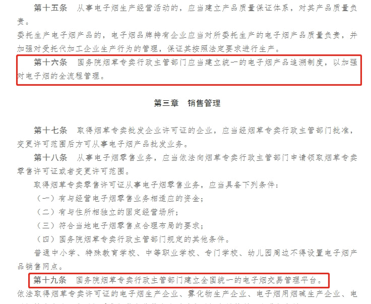 总的来说,以前品牌方用来防伪、防串货的产品溯源技术,后续会普及到工厂生产方面。毕竟管理办法里面已经明文提到了,“国务院烟草专卖行政主管部门应当建立统一的电子烟产品追溯制度,以加强对电子烟的全流程管理。”