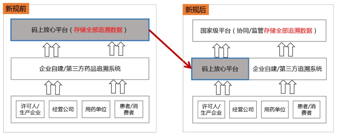 数据存储及架构的改变是此次药品信息化追溯建设的核心内容。最新出台的《药品生产监督管理法》已于2020年7月1日起正式施行,新规实施后,企业药品追溯数据将统一由国家协同/监管平台来进行存储,而企业的药品追溯系统如何与国家协同平台进行对接将是广大药企的“必修课”。