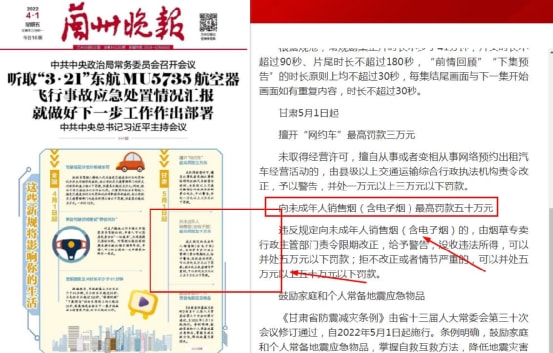 4月3日获悉消息,《甘肃省烟草专卖若干规定》由省十三届人大常委会第三十次会议修订通过,自2022年5月1日起施行。若干规定提出,违反规定向未成年人销售烟(含电子烟)的,由烟草专卖行政主管部门责令限期改正,给予警告,没收违法所得,可以并处五万元以下罚款;拒不改正或者情节严重的,责令暂停烟草专卖零售业务、进行整顿或者吊销烟草专卖零售许可证,可以并处五万元以上五十万元以下罚款。