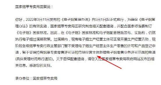 4月3日获悉,随着电子烟落地临近,烟草局也公开表态。对于电子烟是否需要落地细则,中国烟草局如下答复:“2022年3月11日发布的《电子烟管理办法》自5月1日起正式施行,为确保《电子烟管理办法》的有效实施,国家烟草专卖局正研究制定相关配套措施,并配合国家标准委制订《电子烟》国家标准。关于后续配套措施,请您关注国家烟草专卖局政府网站发布的相关信息。感谢您的支持。”
