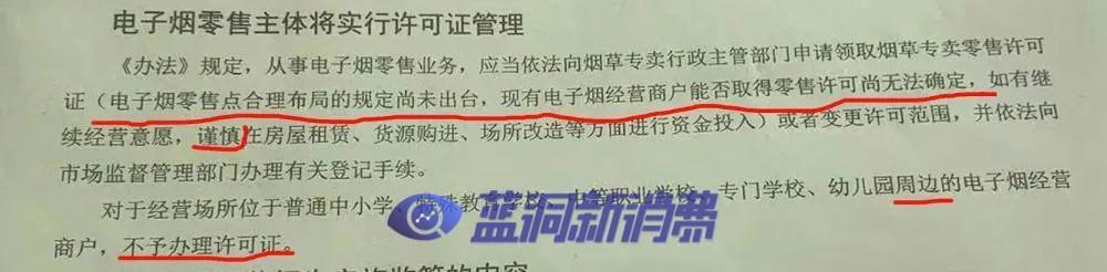 通知明确提到,电子烟零售主体将施行许可证管理。 其中特别提到目前电子烟零售点合理布局的规定尚未出台,现有电子烟经营商户能否取得零售许可尚无法确定 , 如果有继续经营意向,谨慎在房屋租赁、货源购进、场所改造等方面进行资金投入。