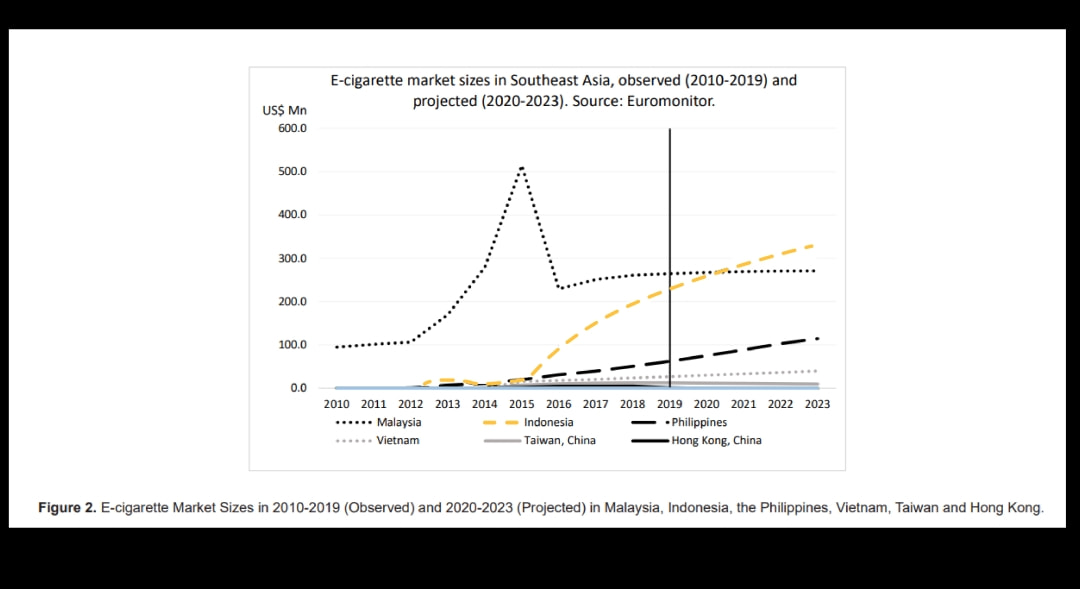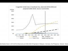 2019年电子雾化类产品在马来西亚、印度尼西亚、菲律宾、越南等六个东南亚市场总市场价值达到5.95亿美元,其中,印度尼西亚成为了价值2.27亿美元的成熟电子雾化市场。预计到2023年,东南亚地区的电子雾化总市场将增长29%,至7.66亿美元。