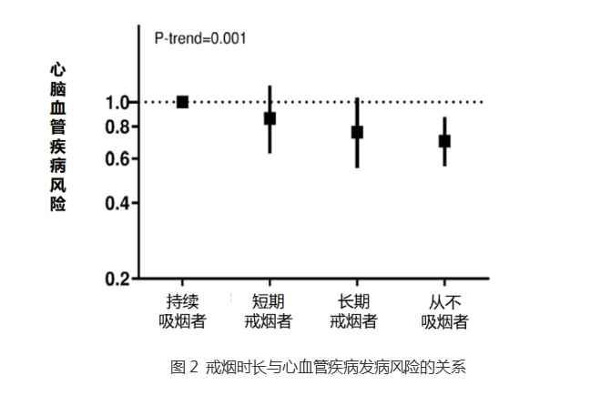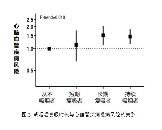 针对一些人吸烟或戒烟后复吸是为了控制体重,该研究还分析了短暂吸烟或复吸对心血管病的风险,结果显示即使是短期复吸者,其心血管病的发病风险同样会增加,并且吸烟时间越长,心血管病风险越高(见图3)。