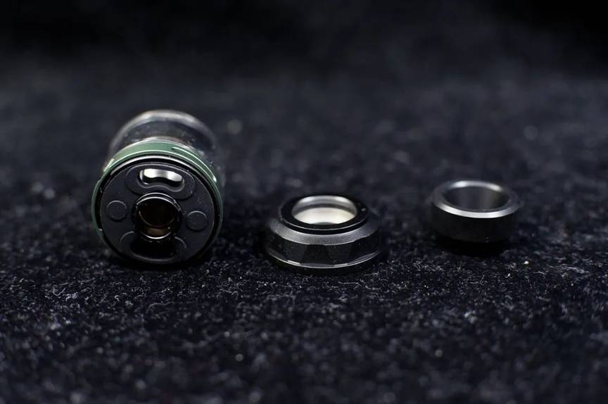 作为重型设备,与之配套名为INTAKE SUBOHM TANK的成品雾化器自然也是个25mm直径大家伙。别看它的可调节进气设置在上方,但是它是通过气道的改变从而导流到底部上升的一个气道,这种设计已经很常见,其好处就是冷凝不容易外泄,烟油不容易漏出。