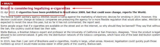 烟草公司向巴西卫生机构施压,要求其制定更灵活的监管措施,允许电子烟销售。预计巴西卫生机构今年将重新讨论这个问题。2019年,不到1%的巴西人使用电子烟,主要分布在发达的城市地区。如果电子烟合法化,并在全巴西范围内进行推广,可以预见当地电子烟消费者比例将大幅提升。