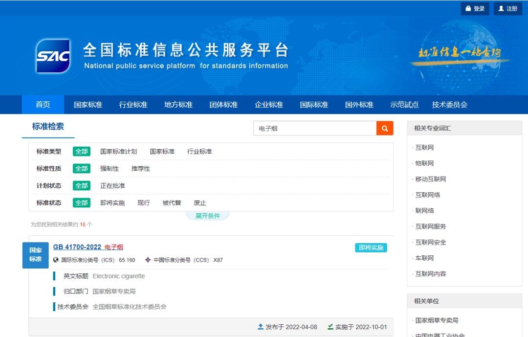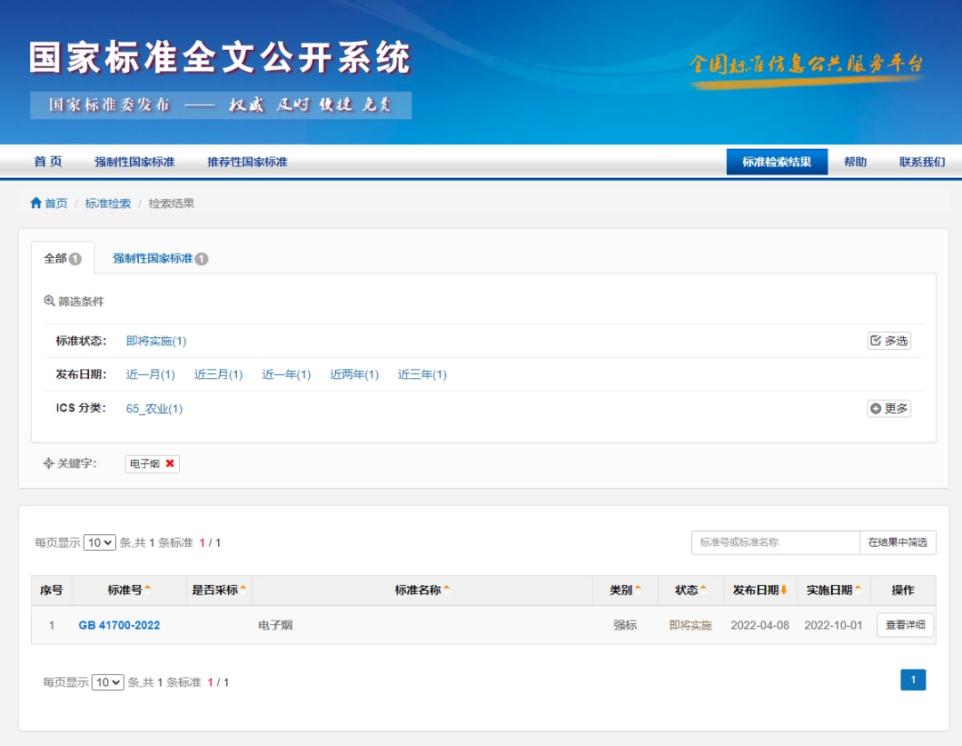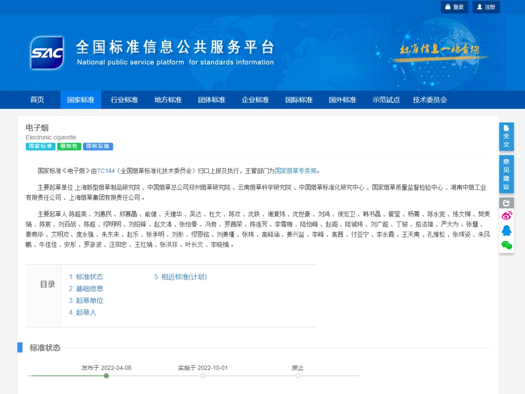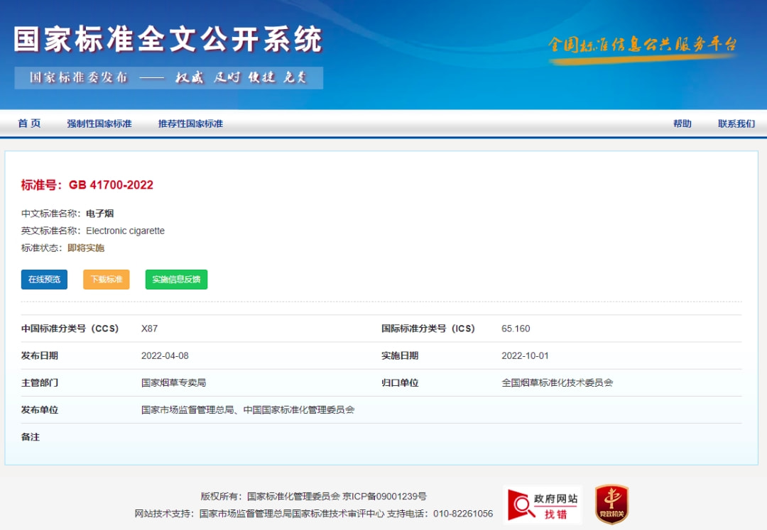 笔者今日在全国标准信息公共服务平台中查询到,电子烟国家标准已经正式发布,将于10月1日起正式实施。