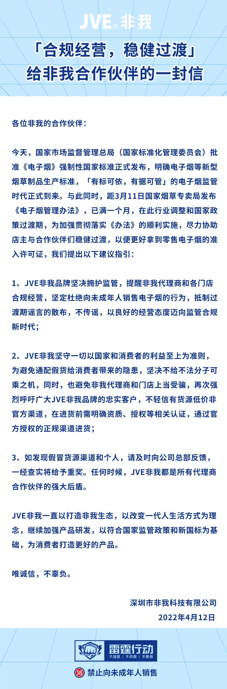 1、jve非我品牌坚决拥护监管,提醒非我代理商和各门店合规经营,坚定杜绝向未成年人销售电子烟的行为,抵制过渡期谣言的散布,不传谣,以良好的经营态度迈向监管合规新时代;