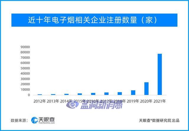 天眼查数据显示,截至目前,我国电子烟相关企业14.8万家,其中,2021年新增注册企业7.7万家,增速125.4%。