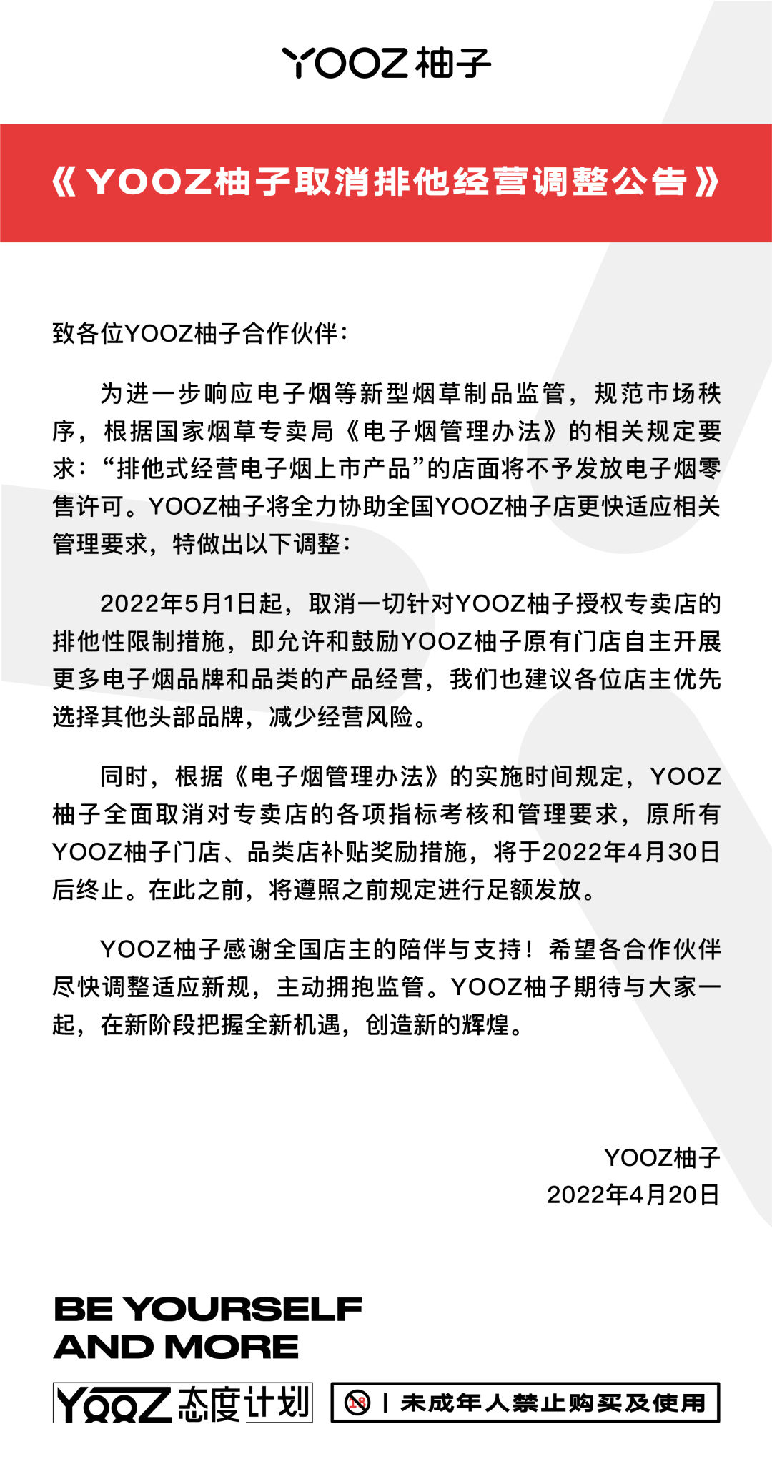 2022年5月1日起,取消一切针对YOOZ柚子授权专卖店的排他性限制措施,即允许和鼓励YOOZ柚子原有门店自主开展更多电子烟品牌和品类的产品经营,我们也建议各位店主优先选择其他头部品牌,减少经营风险。