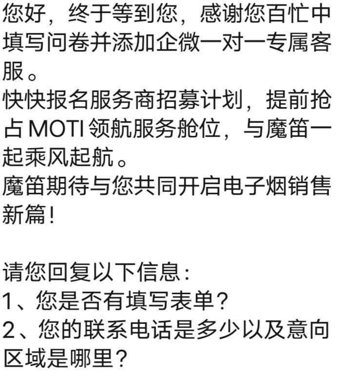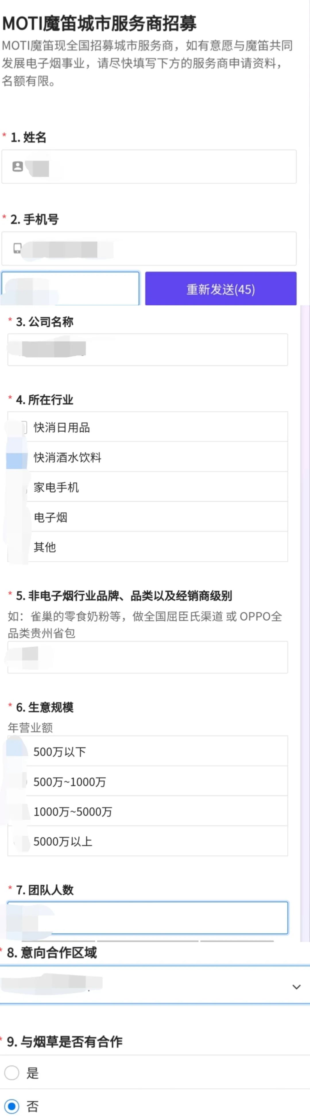 想要成为魔笛服务商,需要先填写申请资料,而在相关资料中,除了姓名、联系方式等基础信息,还有公司名称、所在行业、经销商级别、生意规模、团队人数、意向合作领域、与烟草是否有合作等内容。