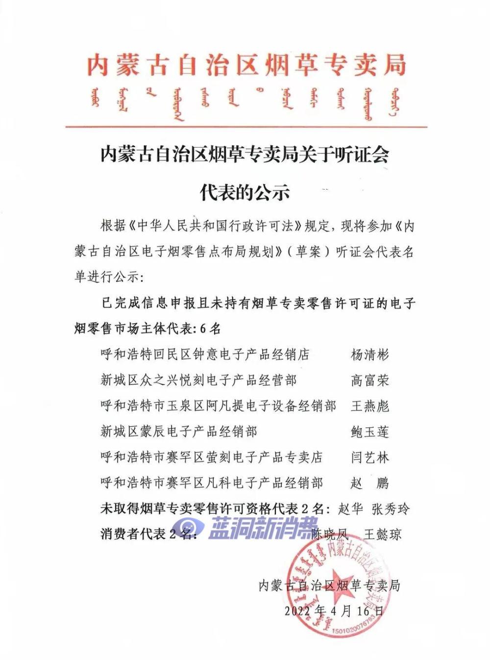 4月20日上午10点,内蒙古自治区电子烟零售点布局规划听证会在呼和浩特烟草专卖局举行,这应该是目前33个省级烟草单位中最先召开听证会的烟草单位。