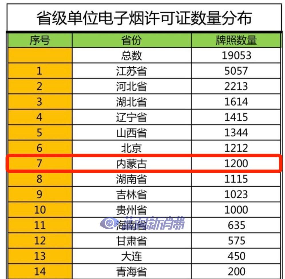 内蒙古电子烟零售许可证规划数量为1200张,仅次于北京,超过湖南和吉林。