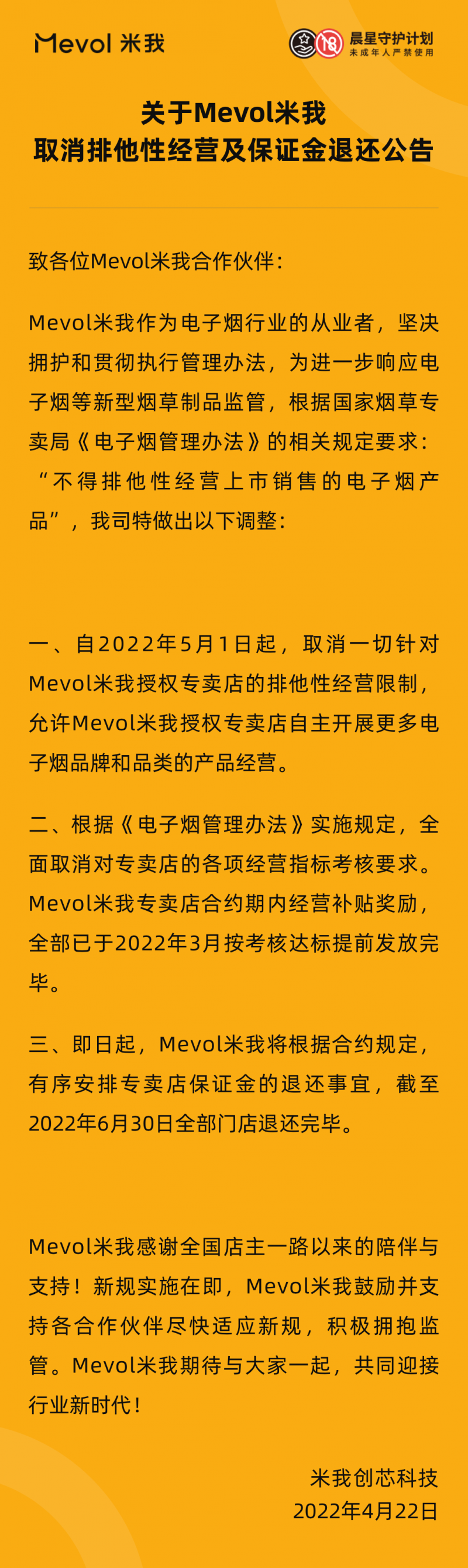 核心提示:关于Mevol米我取消排他性经营及保证金退还公告