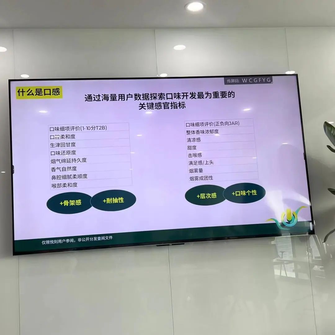 在现场,悦刻还通过投屏展示了对于口味研发最为重要的关键感官指标:口腔柔和度、生津回甘度、口味还原度、香气自然等、喉部柔和度、击喉感、清凉感、甜度、满足感、烟雾量、整体香味浓郁度均在列。