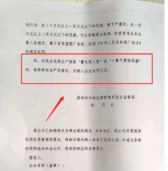 而“雾化吸入管”和“口鼻器物给药器”正是部分0尼古丁产品所使用的品类名称。根据知情人士提供的这份保证书,其中提到,生产符合电子烟定义的产品,必须取得《烟草专卖生产企业许可证》,只有械字号是不够的。深圳监督局提到“对符合电子烟定义,且未取得《烟草专卖生产企业许可证》生产电子烟的,我局发现,将移送烟草管理部门处理。”而且不允许对产品进行“容易引人误解的宣传”,一旦发现将面临罚款,甚至会被吊销营业执照。提到经营者不得对其商品的性能、功能、质量、销售状况、用户评价、曾获荣誉等作虚假或者引人误解的商业宣传,欺骗、误导消费者。