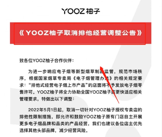 4月23日消息,随着电子烟新规落地日期渐近,国内众多电子烟品牌推出了取消“排他性”专卖经营等措施!包括柚子、徕米、铂岚、唯它等品牌都已经宣布了这个政策措施。其中,电子雾化行业头部品牌YOOZ柚子官方宣布取消专卖店排他性限制措施,允许和鼓励YOOZ专卖店开展多品牌经营。提到,2022年5月1日起,取消一切针对授权专卖店的排他性限制措施,即允许和鼓励原有门店自主开展更多电子烟品牌和品类的产品经营,我们也建议各位店主优先选择其他头部品牌,减少经营风险。同时,根据《电子烟管理办法》的实施时间规定,全面取消对专卖店的各项指标考核和管理要求,原所有门店、品类店补贴奖励措施,将于2022年4月30日后终止。在此之前,将遵照之前规定进行足额发放。据统计,截止去年9月,YOOZ柚子专卖店数量已突破7000家,根据公告时间表,意味5月1日后将正式放弃原来靠补贴、奖励驱动的渠道关系,而将品牌选择权完全交给市场和用户。公告后柚子将加速由原来产、供、销一体化运营模式向“服务商”模式的切换和调整,寻求在《电子烟管理办法》框架下的新的渠道关系新模式,同时将主要精力聚焦于产品研发、技术创新及品牌合规。