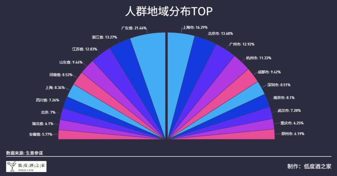 根据上面三组数据,我们大概可以想象出低度酒当前的受众人群,这与大多数品牌定位的她经济、Z世代是基本吻合的,大城市的年轻人。