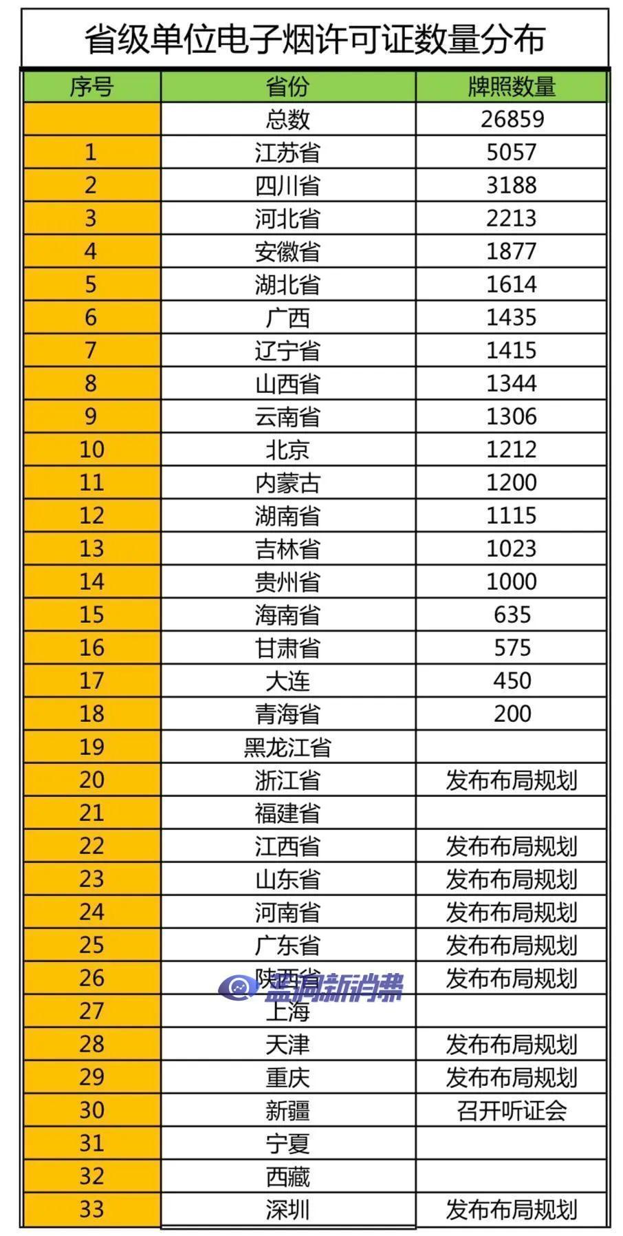 4月24日消息,截至目前,全国电子烟零售许可证已布局规划26859张,18个省市已发布,目前还有15个省市未发布具体许可证数量,以及5个省级烟草公司未发布电子烟零售布局规划和许可证数量。