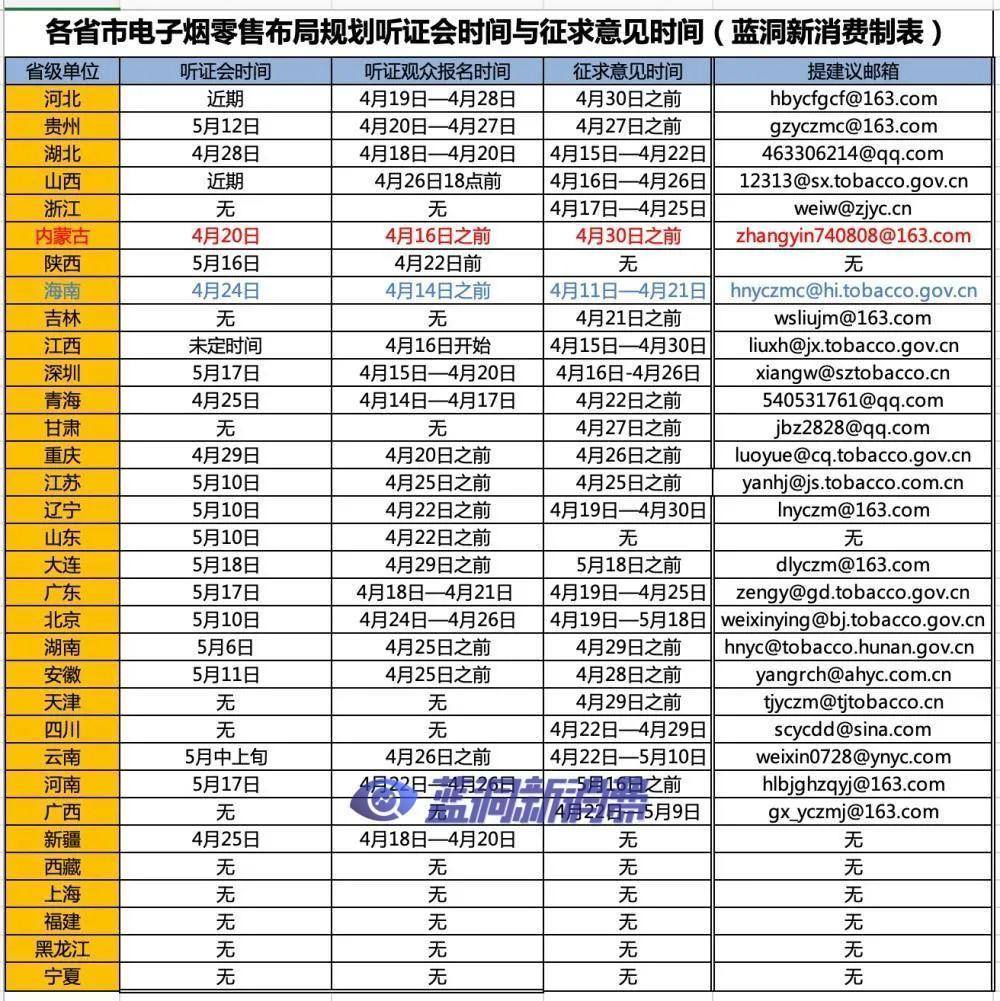 从表格可以看到各省级烟草单位具体时间安排,最晚在5月18日举行听证会,最早的要数内蒙古和海南。