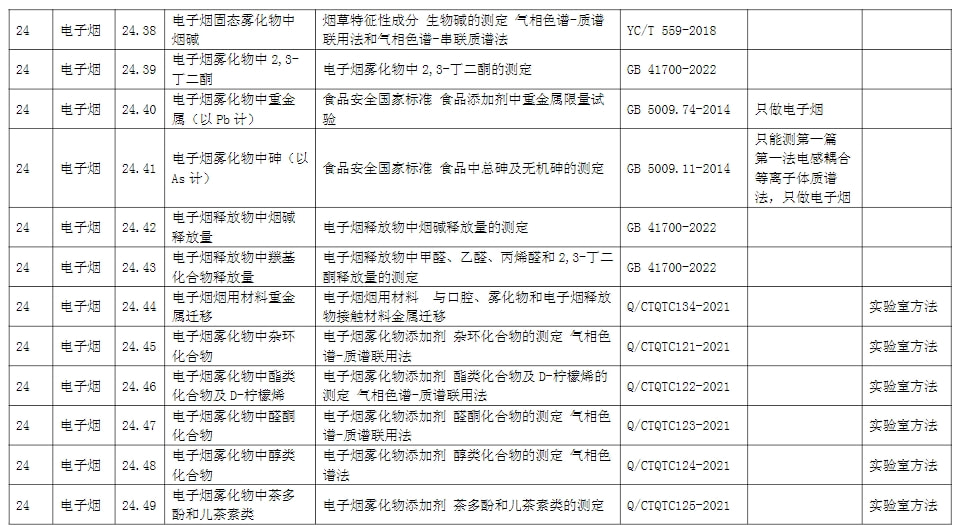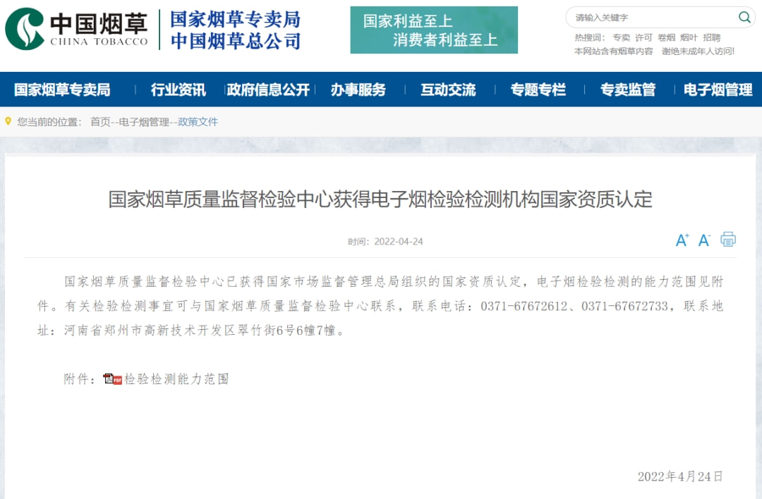 国家烟草质量监督检验中心已获得国家市场监督管理总局组织的国家资质认定,电子烟检验检测的能力范围见附件。有关检验检测事宜可与国家烟草质量监督检验中心联系,联系电话:0371-67672612、0371-67672733,联系地址:河南省郑州市高新技术开发区翠竹街6号6幢7幢。 2022年4月24日 国家烟草局官网