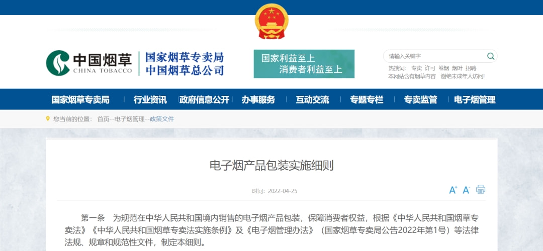 据悉,国家烟草专卖局4月25日发布《电子烟产品包装实施细则》。