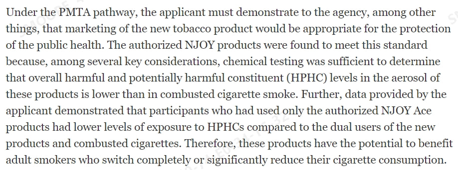 “ 经授权的 NJOY 产品之所以符合标准,是因为在几个关键考虑因素中,化学测试足以确定这些产品气溶胶中的总体有害和潜在有害成分 (HPHC) 水平低于燃烧的香烟烟雾中的水平。 ”