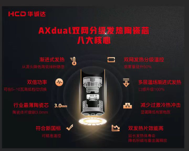 据悉,AXdual 采用双网分级发热陶瓷芯,搭载行业首款双网片,整体陶瓷基体最薄厚度仅3.0mm,比之前减薄31%,为目前行业最薄陶瓷芯。AXdual 在使用性能上实现了双网分级发热、精准温控、口感提升、符合新国标等八大突破。这也是华诚达继2019年发布首款陶瓷芯之后的又一匠作。