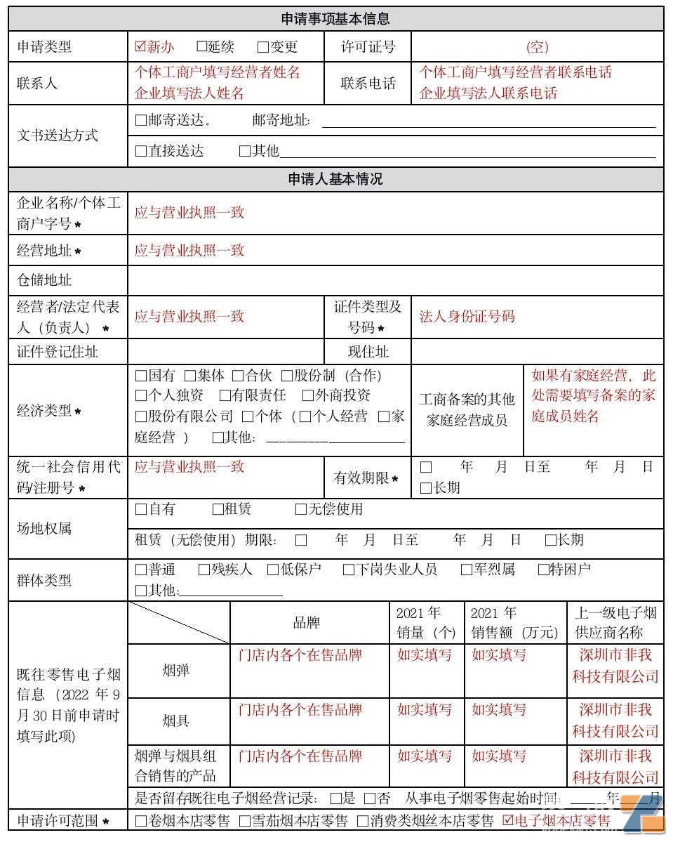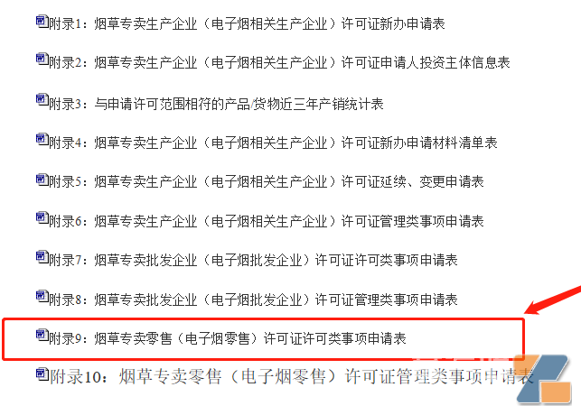 打开《电子烟生产经营主申请许可证办事须知》,找到末尾附录。零售店主需要填写的是附录9,烟草专卖零售(电子烟零售)许可证许可类事项申请表。