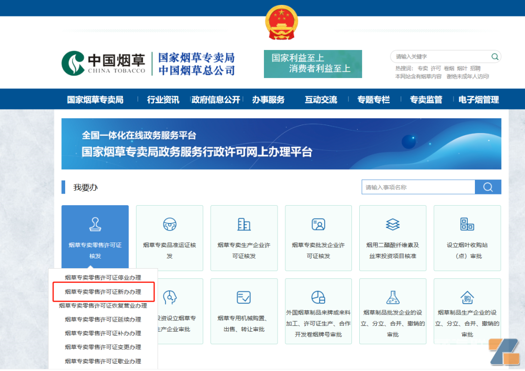 ⑥将鼠标放在“烟草专卖零售许可证核发”上,会出现下拉菜单,选择第二项新办办理;