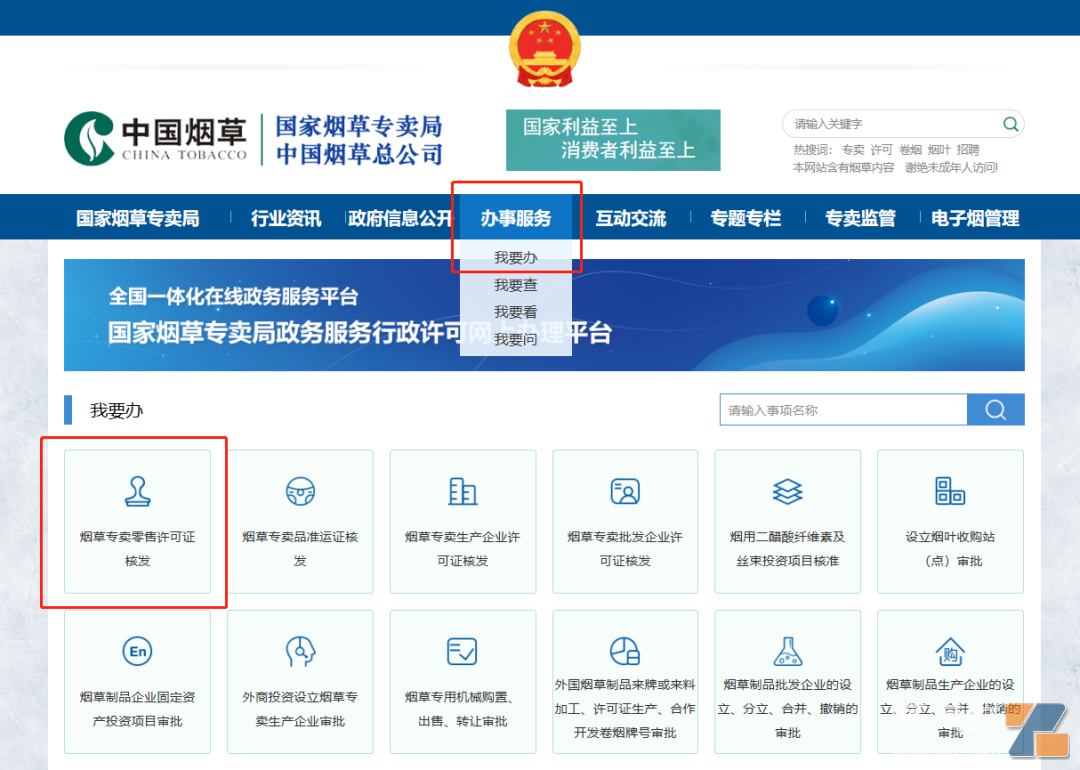 ⑤在“办事服务”栏目下,点击“我要办”,打开“烟草专卖零售许可证核发”;