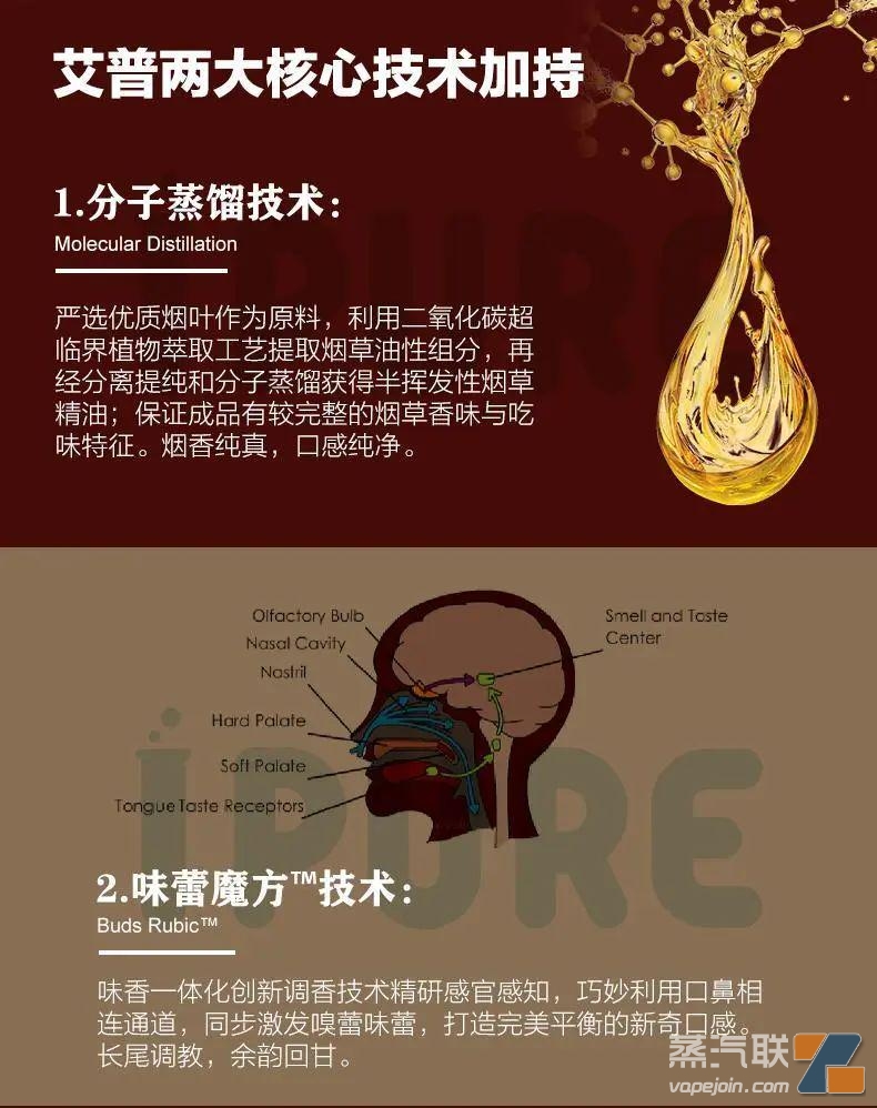 “值得一提的是,这个系列中的金标烟草,不管是口感还是纯正度都非常接近卷烟的体验。”纯馥™系列采用了优质烟叶为原料,利用分子蒸馏技术,有效去除杂质,高度提炼出烟草精油,再运用到雾化液调配上。这让纯馥™系列具有非常明显的烟草特征香味和吃味,回归了烟香的本真。同时,加入Buds Rubik™ 味蕾魔方味香一体化调香技术同步激发嗅觉和味觉,打造新奇平衡体验。