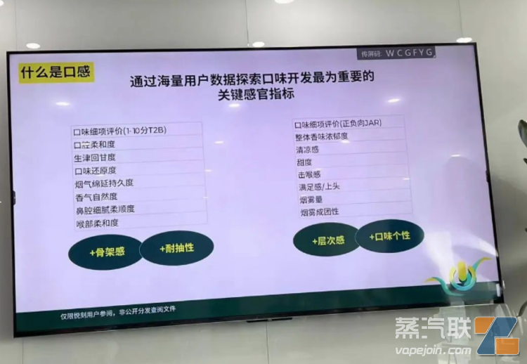 悦刻的烟草味产品似乎已显露雏形。悦刻于4月下旬邀请了10位用户品鉴正在研发中的烟草风味烟弹,品鉴人士反馈称,烟草复合味对于电子烟民来说,相比于果味烟弹吸引力稍显不足,在抽吸过程中能够感受到明显的烟草味,其他复合味则起到陪衬作用。悦刻还通过投屏展示了对于口味研发最为重要的关键感官指标:口腔柔和度、生津回甘度、口味还原度、香气自然等、喉部柔和度、击喉感、清凉感、甜度、满足感、烟雾量、整体香味浓郁度均在列。对于电子烟来说,虽然管理办法限制烟草口味,但101种添加物配比的不同,也能产生口味、口感表现各异的“烟草味”,这对于电子烟生产企业来说,既是挑战也是机遇。