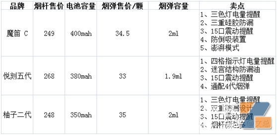 上图从左到右,分别是对应品牌的入门级产品,以低价打开市场,魔笛GO,悦刻清风,YOOZ mini,参数方面如下: