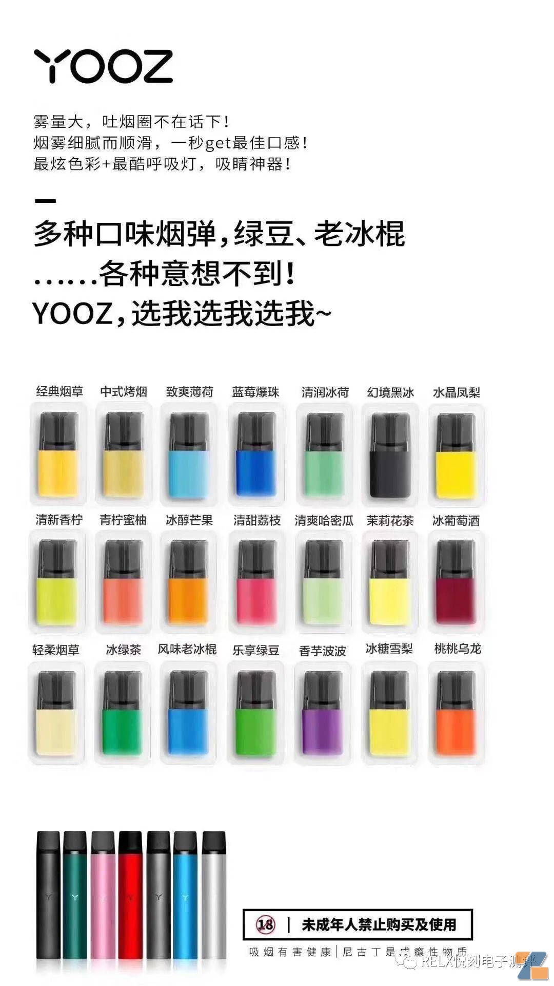 YOOZ团队围绕“灵感与健康,缺一不可”理念,秉承匠心精神,从人体工程学和工业设计的角度出发,严格选材,研制能够为消费者提供舒适体验,时尚且耐用的电子烟产品。截至目前,YOOZ电子烟推出的产品有孤境黑、深蓝灰、炙烈红等多种颜色,上市的产品有薄荷、烟草、绿豆、黑冰等多种,未来还会有更多口味的产品走向市场。