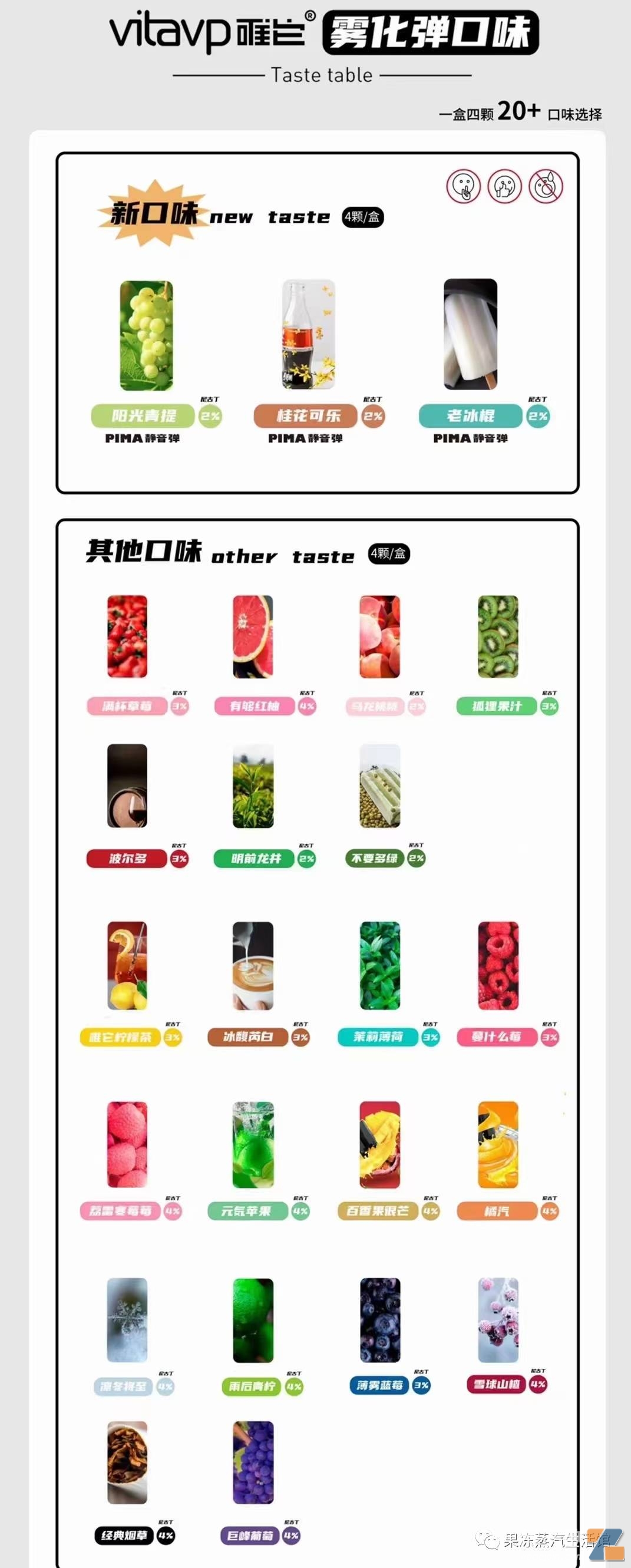 此次的新口味烟弹进行了优化改良,采用PIMA弹,静音消除烟弹啪啪的声音,冷凝液不会入口,让用户体验的口感更佳。
