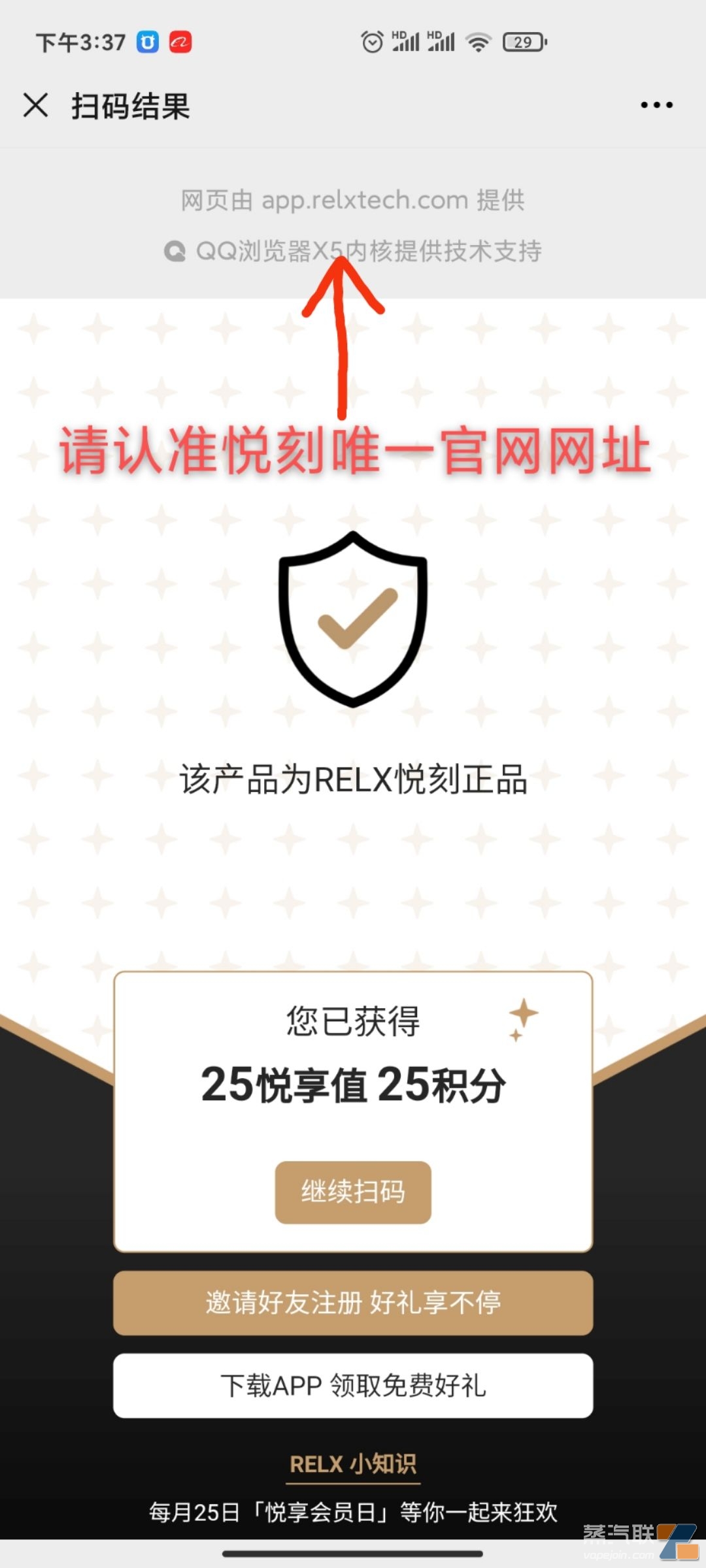 上面这张图片就是relx悦刻官方生产的电子烟烟弹扫码所出现的界面,界面上有显示扫码获取了什么产品,并且扫码后将页面往下面拉可以看出官方网址app.relxtech.com