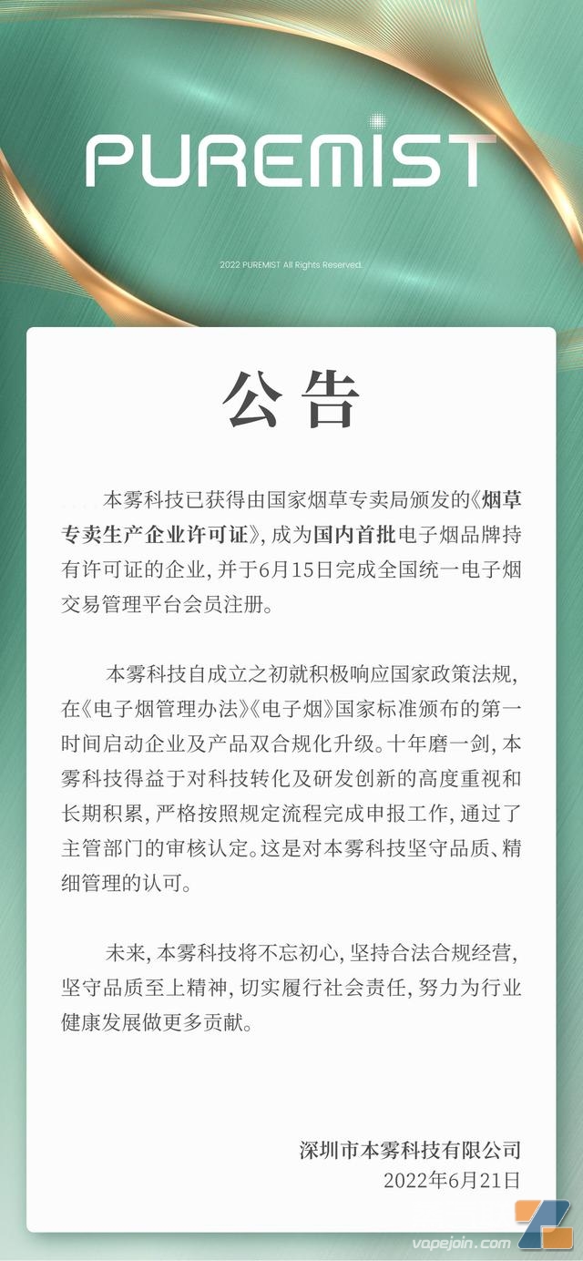 据深圳市本雾科技有限公司(下称本雾科技)公告显示,本雾科技已于2022年6月21日取得由国家烟草专卖局颁发的《烟草专卖生产企业许可证》,是首批获得该许可证的电子烟企业,本雾科技旗下品牌“PUREMIST”亦成为首批获证电子烟品牌。