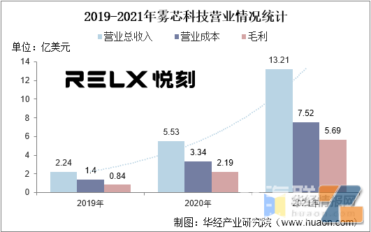 雾芯科技创立于2018年,主营业务包括电子雾化器产品的研发、设计、制造及销售。凭借覆盖全产业链的核心技术与能力,快速占领电子烟行业市场份额,2021年雾芯科技营业收入快速增长,达13.21亿美元,毛利为5.69亿美元,利润率约为43%。
