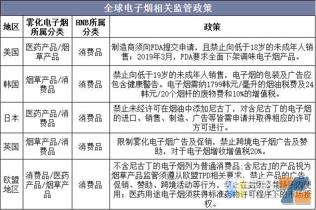 电子烟是新产品,在中国萌芽,风行欧美,在国外也已流行多年,不同国家和区域管理方法 不同,有些区域是完全禁止电子烟,有些区域如美国非常欢迎电子烟,还有多数区域是边走边看,根据市场情况制定监管规则。禁止向未成年人售卖电子烟产品几乎为全球共识,调味电子烟产品被美国FDA下架对电子烟行业产生一定的影响。