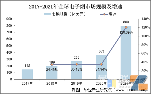 世界卫生组织、英国公共卫生部、美国疾病控制和预防中心等国外主流权威机构对电子烟进行了持续数年的评估,现阶段普遍认为电子烟的危害性远小于传统烟草,可作为吸烟人群的控烟戒烟策略,美国国家科学院、工程院和医学院评估表明“完全使用电子烟替代香烟,可减少使用者接触香烟燃烧产生的多种有毒物和致癌物的机会。”2021年,全球电子烟市场高速增长,市场规模达800亿美元,同比增长120.39%。