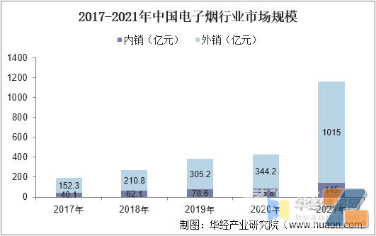 中国电子烟行业是疫情期间逆势增长的代表性行业之一,烟民对电子烟的减害性认知越来越高,戒烟减害逐渐成为主流声音。总体来看,外销市场规模较内销市场更大,国外英国、美国和日本等地区的电子烟需求较大,2021年中国电子烟外销市场规模从2020年的344.2亿元迅速增长至1015亿元,增速高达195%,内销市场增长较为平稳,2021年市场规模为145亿元,同比增长73%。
